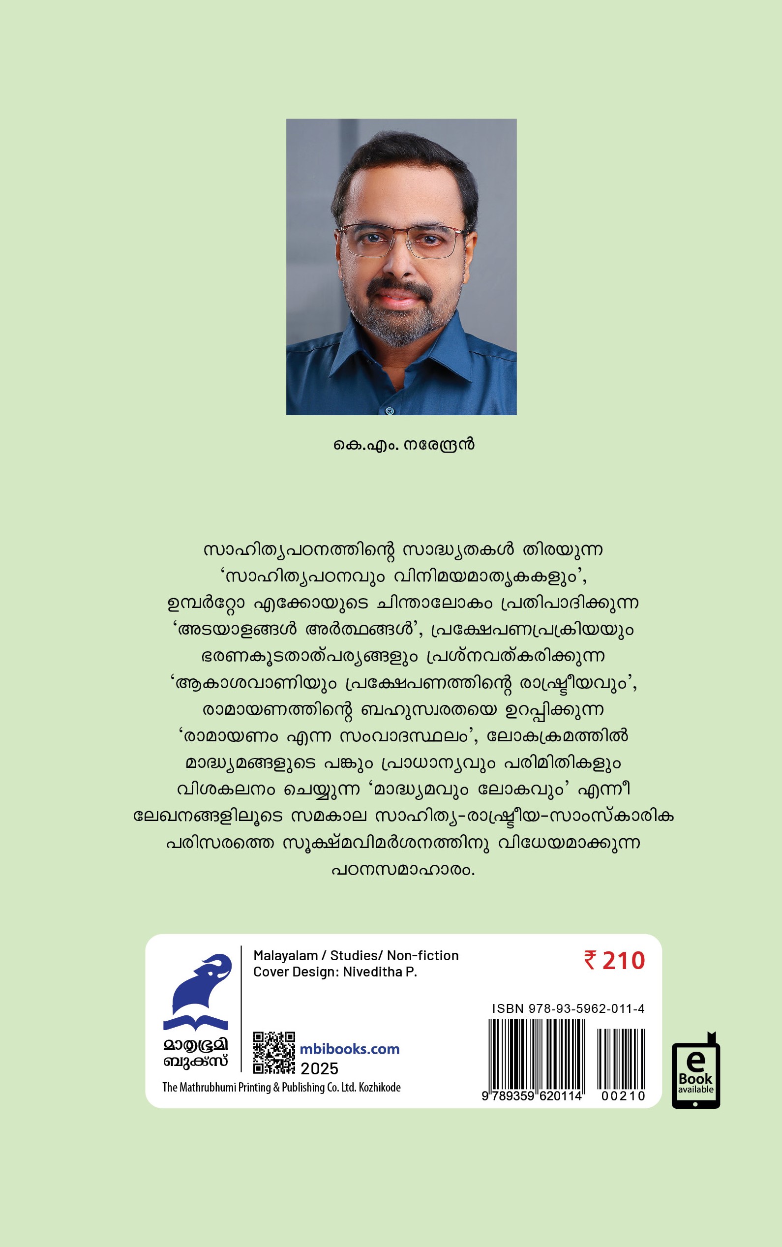 ‘അടയാളങ്ങള് അര്ത്ഥങ്ങള്’, പ്രക്ഷേപണപ്രക്രിയയും ഭരണകൂടതാത്പര്യങ്ങളും പ്രശ്നവത്കരിക്കുന്ന ‘ആകാശവാണിയും പ്രക്ഷേപണത്തിന്റെ രാഷ്ട്രീയവും’, രാമായണത്തിന്റെ ബഹുസ്വരതയെ ഉറപ്പിക്കുന്ന ‘രാമായണം എന്ന സംവാദസ്ഥലം’, ലോകക്രമത്തില് മാദ്ധ്യമങ്ങളുടെ പങ്കും പ്രാധാന്യവും പരിമിതികളും വിശകലനം ചെയ്യുന്ന ‘മാദ്ധ്യമവും ലോകവും’ എന്നീ ലേഖനങ്ങളിലൂടെ സമകാല സാഹിത്യ-രാഷ്ട്രീയ-സാംസ്കാരിക പരിസരത്തെ സൂക്ഷ്മവിമര്ശനത്തിനു വിധേയമാക്കുന്ന പഠനസമാഹാരം.