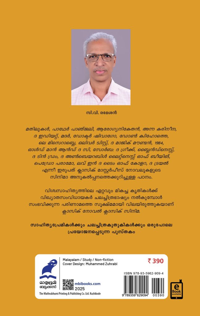 മതിലുകള്, പാഥേര് പാഞ്ജലി, ആരോഗ്യനികേതന്, അന്ന കരിനീന, ദ ഇഡിയറ്റ്, മദര്, ഡോക്ടര് ഷിവാഗോ, ഡോണ് ക്വിഹോത്തെ, ലെ മിസെറാബ്ലെ, ഒലിവര് ട്വിസ്റ്റ്, ദ മാജിക് മൗണ്ടന്, 1984, ഓള്ഡ് മാന് ആന്ഡ് ദ സി, സോര്ബ: ദ ഗ്രീക്ക്, ബ്ലൈന്ഡ്നെസ്സ്, ദ ടിന് ഡ്രം, ദ അണ്ബെയറബിള് ലൈറ്റ്നെസ്സ് ഓഫ് ബീയിങ്, പെഡ്രോ പരാമോ, ലവ് ഇന് ദ ടൈം ഓഫ് കോളറ, ദ ട്രയല് എന്നീ ഇരുപത് ക്ലാസിക് മാസ്റ്റര്പീസ് നോവലുകളുടെ സിനിമാ അനുകല്പ്പനത്തെക്കുറിച്ചുള്ള പഠനം.
