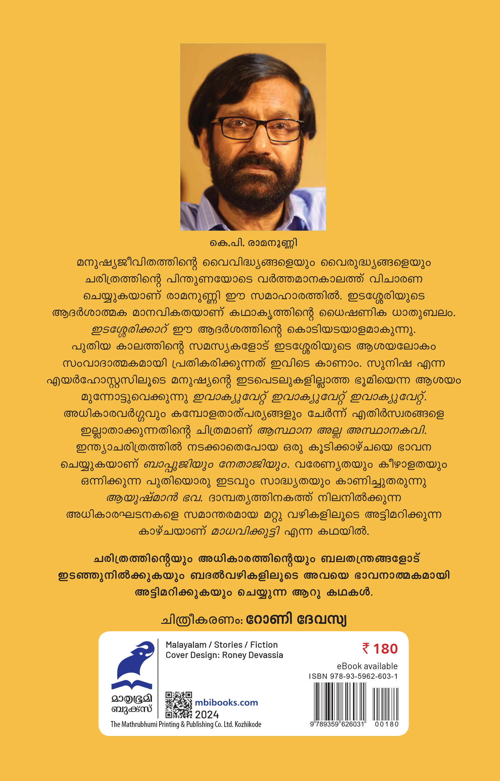ചരിത്രത്തിന്റെയും അധികാരത്തിന്റെയും ബലതന്ത്രങ്ങളോട് ഇടഞ്ഞുനില്ക്കുകയും ബദല്വഴികളിലൂടെ അവയെ ഭാവനാത്മകമായി അട്ടിമറിക്കുകയും ചെയ്യുന്ന ആറു കഥകള്.