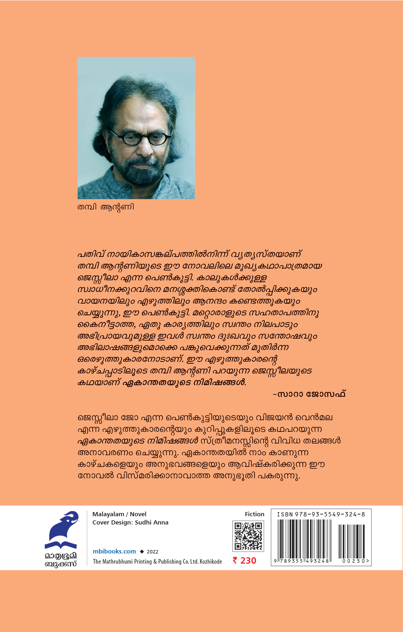 ജെസ്സീലാ എന്ന പെണ്കുട്ടി. കാലുകള്ക്കുള്ള സ്വാധീനക്കുറവിനെ മനശ്ശക്തികൊണ്ട് തോല്പ്പിക്കുകയും വായനയിലും എഴുത്തിലും ആനന്ദം കണ്ടെത്തുകയും ചെയ്യുന്നു, ഈ പെണ്കുട്ടി. മറ്റൊരാളുടെ സഹതാപത്തിനു കൈനീട്ടാത്ത, ഏതു കാര്യത്തിലും സ്വന്തം നിലപാടും അഭിപ്രായവുമുള്ള ഇവള് സ്വന്തം ദുഃഖവും സന്തോഷവും അഭിലാഷങ്ങളുമൊക്കെ പങ്കുവെക്കുന്നത് മുതിര്ന്ന ഒരെഴുത്തുകാരനോടാണ്. ഈ എഴുത്തുകാരന്റെ കാഴ്ചപ്പാടിലൂടെ തമ്പി ആന്റണി പറയുന്ന ജെസ്സീലയുടെ കഥയാണ് ഏകാന്തതയുടെ നിമിഷങ്ങള്.