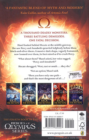 ONE FATAL DECISION. Hazel looked behind Hecate at the middle gateway Shew Perry and Annabeth sprawled helplessly before those black-and-silver doors. A massive dark shape, vaguely humanoid, now loomed over them, its foot raised as if to crush Percy. “What about them? Hazel asked, her voice ragged.