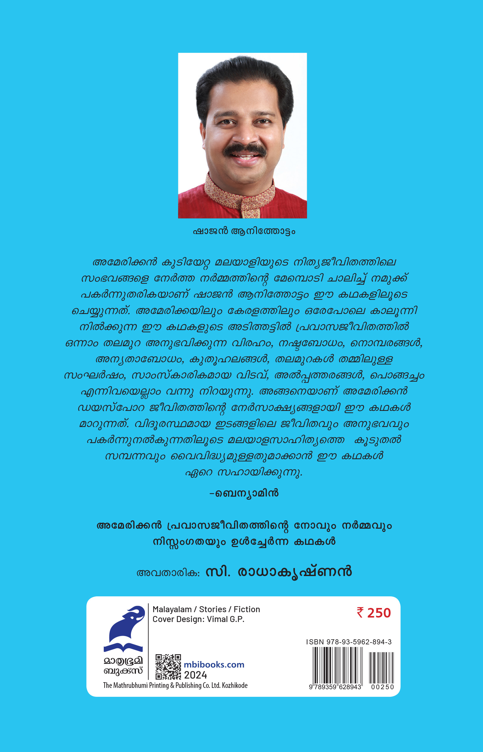 അമേരിക്കന് പ്രവാസജീവിതത്തിന്റെ നോവും നര്മ്മവും നിസ്സംഗതയും ഉള്ച്ചേര്ന്ന കഥകള്