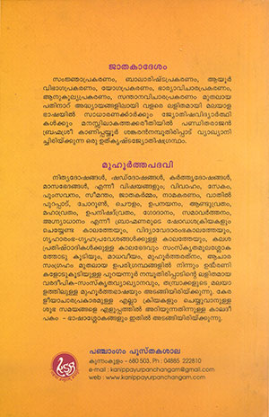 സംജ്ഞാപ്രകരണം, ബാലാരിഷ്ടപ്രകരണം, ആയുർവിഭാഗപ്രകരണം, യോഗപ്രകരണം, ഭാര്യാവിചാരപ്രകരണം, ആനുകൂല്യപ്രകരണം, സന്താനവിചാരപ്രകരണം മുതലായ പതിനാറ് അദ്ധ്യായങ്ങളിലായി വളരെ ലളിതമായി മലയാള ഭാഷയിൽ സാധാരണക്കാർക്കും ജോതിഷവിദ്യാർത്ഥി കൾക്കും മനസ്സിലാകത്തക്ക രീതിയിൽ പണ്ഡിതരാജൻ ബ്രഹ്മശ്രീ കാണിപ്പയ്യൂർ ശങ്കരൻ നമ്പൂതിരിപ്പാട് വ്യാഖ്യാനിച്ചിരിയ്ക്കുന്ന ഒരു ഉത്കൃഷ്ടജ്യോതിഷഗ്രന്ഥം.