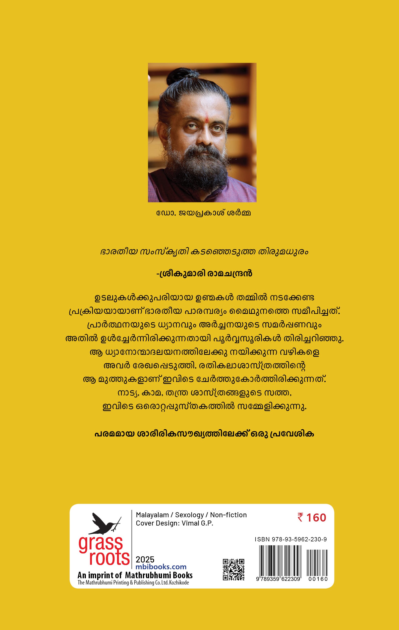 ഉടലുകള്ക്കുപരിയായ ഉണ്മകള് തമ്മില് നടക്കേണ്ട പ്രക്രിയയായാണ് ഭാരതീയ പാരമ്പര്യം മൈഥുനത്തെ സമീപിച്ചത്. പ്രാര്ത്ഥനയുടെ ധ്യാനവും അര്ച്ചനയുടെ സമര്പ്പണവും അതില് ഉള്ച്ചേര്ന്നിരിക്കുന്നതായി പൂര്വ്വസൂരികള് തിരിച്ചറിഞ്ഞു. ആ ധ്യാനോന്മാദലയനത്തിലേക്കു നയിക്കുന്ന വഴികളെ അവര് രേഖപ്പെടുത്തി. രതികലാശാസ്ത്രത്തിന്റെ ആ മുത്തുകളാണ് ഇവിടെ ചേര്ത്തുകോര്ത്തിരിക്കുന്നത്. നാട്യ, കാമ, തന്ത്ര ശാസ്ത്രങ്ങളുടെ സത്ത, ഇവിടെ ഒരൊറ്റപ്പുസ്തകത്തില് സമ്മേളിക്കുന്നു.