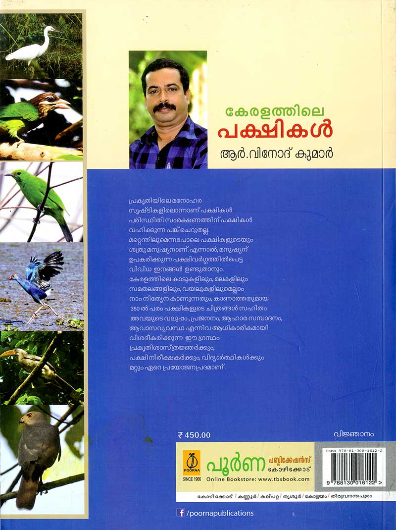 പ്രകൃതിയിലെ മനോഹര സൃഷ്ടികളിലൊന്നാണ് പക്ഷികൾ, പരിസ്ഥിതി സംരക്ഷണത്തിന് പക്ഷികൾ വഹിക്കുന്ന പങ്ക് ചെറുതല്ല. മറ്റെന്തിലുമെന്നപോലെ പക്ഷികളുടെയും ശ്രതു മനുഷ്യനാണ്. എന്നാൽ, മനുഷ്യന് ഉപകരിക്കുന്ന പക്ഷിവർഗ്ഗത്തിൽപെട്ട വിവിധ ഇനങ്ങൾ ഉണ്ടുതാനും. കേരളത്തിലെ കാടുകളിലും മലകളിലും സമതലങ്ങളിലും, വയലുകളിലുമെല്ലാം നാം നിത്യേന കാണുന്നതും, കാണാത്തതുമായ 350 ൽ പരം പക്ഷികളുടെ ചിത്രങ്ങൾ സഹിതം അവയുടെ വലുപ്പം, പ്രജനനം, ആഹാര സമ്പാദനം, ആവാസവ്യവസ്ഥ എന്നിവ ആധികാരികമായി വിശദീകരിക്കുന്ന ഈ ഗ്രന്ഥം പ്രകൃതിശാസ്ത്രജ്ഞർക്കും, പക്ഷിനിരീക്ഷകർക്കും വിദ്യാർത്ഥികൾക്കും മറ്റും ഏറെ പ്രയോജനപ്രദമാണ്.