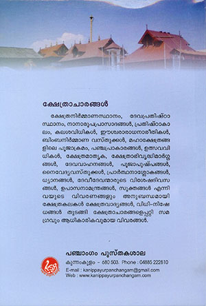 ക്ഷേത്രനിർമ്മാണസ്ഥാനം, ദേവപ്രതിഷ്ഠാസ്ഥാനം, നാനാരൂപപ്രാസാദങ്ങൾ, പ്രതിഷ്ഠാകാലം, കലശവിധികൾ, ഈശ്വരാരാധനാരീതികൾ, ബിംബനിർമ്മാണ വസ്തുക്കൾ, മഹാക്ഷേത്രങ്ങളിലെ പൂജാക്രമം, പഞ്ചപ്രാകാരങ്ങൾ, ഉത്സവവിധികൾ, ക്ഷേത്രമാതൃക, ക്ഷേത്രാഭിവൃദ്ധിമാർഗ്ഗ ങ്ങൾ, ദേവവാഹനങ്ങൾ, പൂജാപുഷ്പങ്ങൾ, നൈവേദ്യവസ്തുക്കൾ, പ്രാർത്ഥനാ ശ്ലോകങ്ങൾ, ധ്യാനങ്ങൾ, ദേവീദേവന്മാരുടെ വിശേഷദിവസങ്ങൾ, ഉപാസനാമന്ത്രങ്ങൾ, സൂക്തങ്ങൾ എന്നിവയുടെ വിവരണങ്ങളും അനുബന്ധമായി ക്ഷേത്രകലകൾ ക്ഷേത്രവാദ്യങ്ങൾ, വിധി-നിഷേധങ്ങൾ തുടങ്ങി ക്ഷേത്രാചാരങ്ങളെപ്പറ്റി സമഗ്രവും ആധികാരികവുമായ വിവരങ്ങൾ.