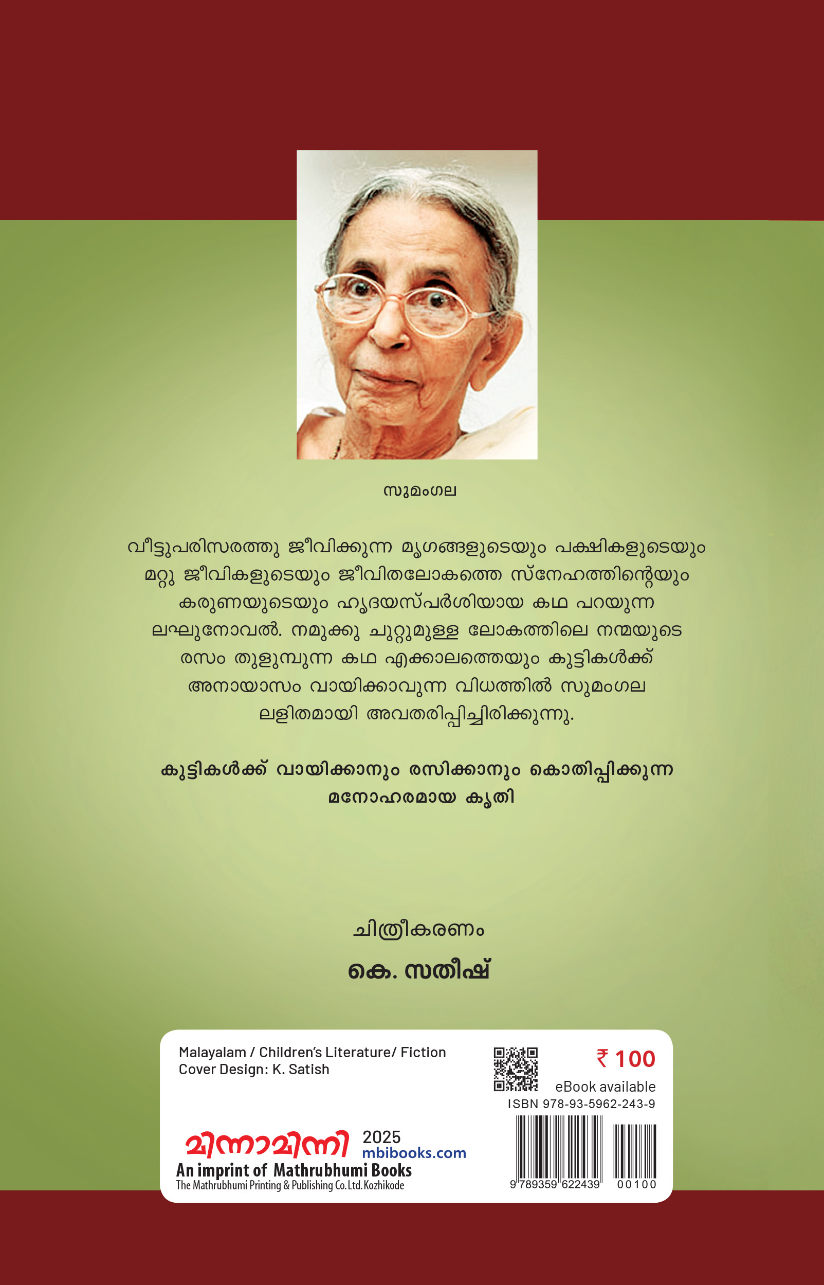 വീട്ടുപരിസരത്തു ജീവിക്കുന്ന മൃഗങ്ങളുടെയും പക്ഷികളുടെയും മറ്റു ജീവികളുടെയും ജീവിതലോകത്തെ സ്നേഹത്തിന്റെയും കരുണയുടെയും ഹൃദയസ്പര്ശിയായ കഥ പറയുന്ന ലഘുനോവല്. നമുക്കു ചുറ്റുമുള്ള ലോകത്തിലെ നന്മയുടെ രസം തുളുമ്പുന്ന കഥ എക്കാലത്തെയും കുട്ടികള്ക്ക് അനായാസം വായിക്കാവുന്ന വിധത്തില് സുമംഗല ലളിതമായി അവതരിപ്പിച്ചിരിക്കുന്നു.