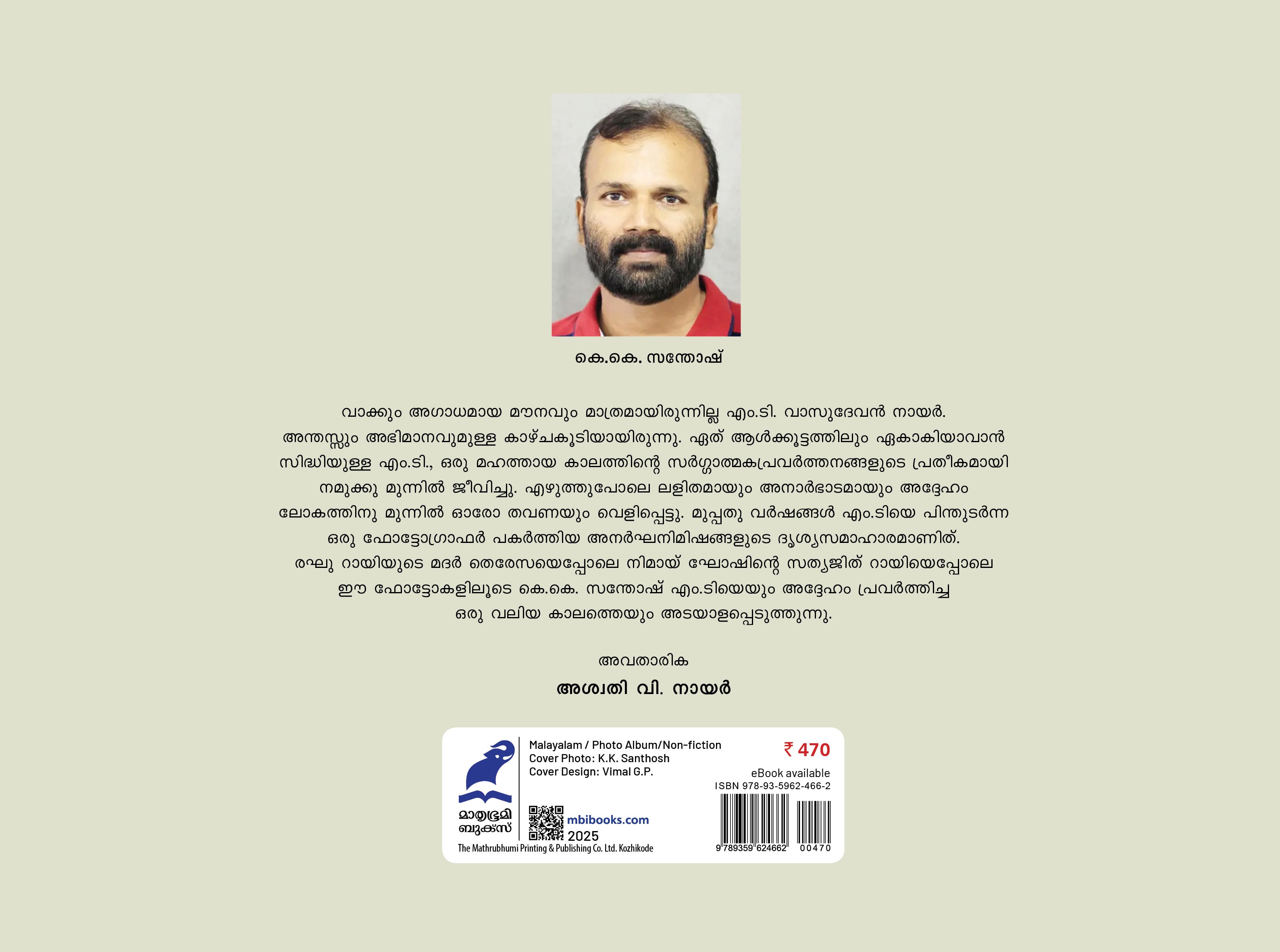 വാക്കും അഗാധമായ മൗനവും മാത്രമായിരുന്നില്ല എം.ടി. വാസുദേവന് നായര്. അന്തസ്സും അഭിമാനവുമുള്ള കാഴ്ചകൂടിയായിരുന്നു. ഏത് ആള്ക്കൂട്ടത്തിലും ഏകാകിയാവാന് സിദ്ധിയുള്ള എം.ടി., ഒരു മഹത്തായ കാലത്തിന്റെ സര്ഗ്ഗാത്മകപ്രവര്ത്തനങ്ങളുടെ പ്രതീകമായി നമുക്കു മുന്നില് ജീവിച്ചു. എഴുത്തുപോലെ ലളിതമായും അനാര്ഭാടമായും അദ്ദേഹം ലോകത്തിനു മുന്നില് ഓരോ തവണയും വെളിപ്പെട്ടു. മുപ്പതു വര്ഷങ്ങള് എം.ടിയെ പിന്തുടര്ന്ന ഒരു ഫോട്ടോഗ്രാഫര് പകര്ത്തിയ അനര്ഘനിമിഷങ്ങളുടെ ദൃശ്യസമാഹാരമാണിത്. രഘു റായിയുടെ മദര് തെരേസയെപ്പോലെ നിമായ് ഘോഷിന്റെ സത്യജിത് റായിയെപ്പോലെ ഈ ഫോട്ടോകളിലൂടെ കെ.കെ. സന്തോഷ് എം.ടിയെയും അദ്ദേഹം പ്രവര്ത്തിച്ച ഒരു വലിയ കാലത്തെയും അടയാളപ്പെടുത്തുന്നു.
