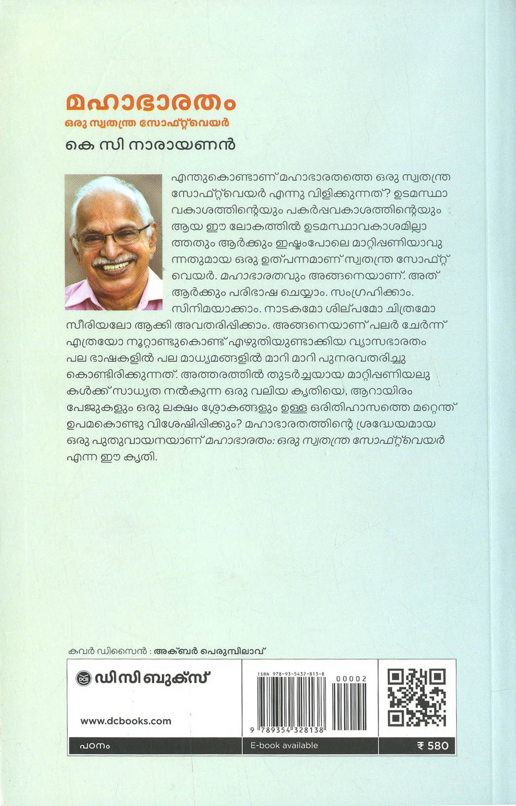 എന്തുകൊണ്ടാണ് മഹാഭാരതത്തെ ഒരു സ്വതന്ത സോഫ്റ്റ് വെയർ എന്നു വിളിക്കുന്നത്? ഉടമസ്ഥാവകാശത്തിന്റെയും പകർപ്പവകാശത്തിന്റെയും ആയ ഈ ലോകത്തിൽ ഉടമസ്ഥാവകാശമില്ലാത്തതും ആർക്കും ഇഷ്ടംപോലെ മാറ്റിപ്പണിയാവുന്നതുമായ ഒരു ഉത്പന്നമാണ് സ്വതന്ത്ര സോഫ്റ്റ് വെയർ. മഹാഭാരതവും അങ്ങനെയാണ്. അത് ആർക്കും പരിഭാഷ ചെയ്യാം. സംഗ്രഹിക്കാം. സിനിമയാക്കാം. നാടകമോ ശില്പമോ ചിത്രമോ സീരിയലോ ആക്കി അവതരിപ്പിക്കാം. അങ്ങനെയാണ് പലർ ചേർന്ന് എത്രയോ നൂറ്റാണ്ടുകൊണ്ട് എഴുതിയുണ്ടാക്കിയ വ്യാസഭാരതം പല ഭാഷകളിൽ പല മാധ്യമങ്ങളിൽ മാറി മാറി പുനരവതരിച്ചു കൊണ്ടിരിക്കുന്നത്. അത്തരത്തിൽ തുടർച്ചയായ മാറ്റിപ്പണിയലുകൾക്ക് സാധ്യത നൽകുന്ന ഒരു വലിയ കൃതിയെ, ആറായിരം പേജുകളും ഒരു ലക്ഷം ശ്ലോകങ്ങളും ഉള്ള ഒരിതിഹാസത്തെ മറ്റെന്ത് ഉപമകൊണ്ടു വിശേഷിപ്പിക്കും? മഹാഭാരതത്തിന്റെ ശ്രദ്ധേയമായ ഒരു പുതുവായനയാണ് മഹാഭാരതം: ഒരു സ്വതന്ത്ര സോഫ്റ്റ് വെയർ എന്ന ഈ കൃതി.