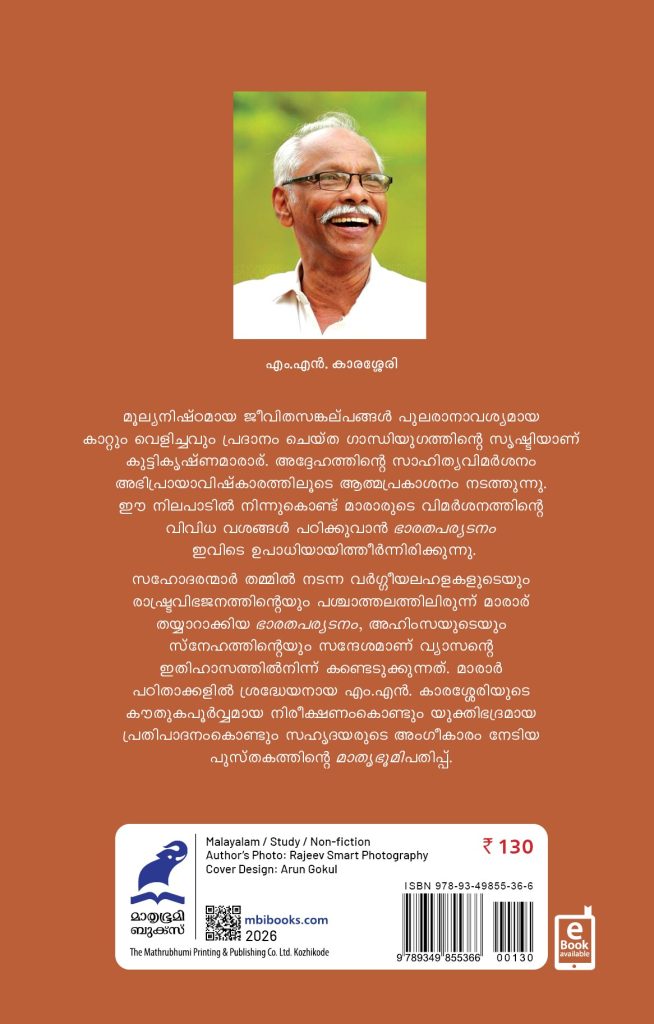 സഹോദരന്മാർ തമ്മിൽ നടന്ന വർഗ്ഗീയലഹളകളുടെയും രാഷ്ട്രവിഭജനത്തിന്റെയും പശ്ചാത്തലത്തിലിരുന്ന് മാരാര് തയ്യാറാക്കിയ ഭാരതപര്യടനം, അഹിംസയുടെയും സ്നേഹത്തിന്റെയും സന്ദേശമാണ് വ്യാസന്റെ ഇതിഹാസത്തിൽനിന്ന് കണ്ടെടുക്കുന്നത്. മാരാർ പഠിതാക്കളിൽ ശ്രദ്ധേയനായ എം.എൻ. കാരശ്ശേരിയുടെ കൗതുകപൂർവ്വമായ നിരീക്ഷണംകൊണ്ടും യുക്തിഭദ്രമായ പ്രതിപാദനംകൊണ്ടും സഹൃദയരുടെ അംഗീകാരം നേടിയ പുസ്തകത്തിന്റെ മാതൃഭൂമി പതിപ്പ്.