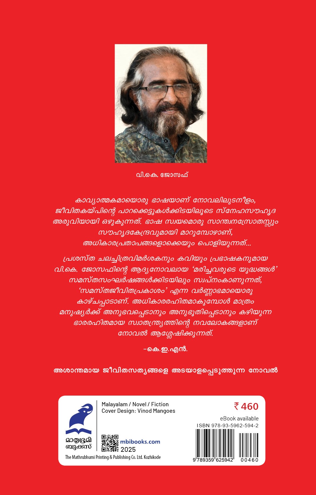 അധികാരപ്രതാപങ്ങളൊക്കെയും പൊളിയുന്നത്… പ്രശസ്ത ചലച്ചിത്രവിമര്ശകനും കവിയും പ്രഭാഷകനുമായ വി.കെ. ജോസഫിന്റെ ആദ്യനോവലായ ‘മരിച്ചവരുടെ യുദ്ധങ്ങള്’ സമസ്തസംഘര്ഷങ്ങള്ക്കിടയിലും സ്വപ്നംകാണുന്നത്, ‘സമസ്തജീവിതപ്രകാശം’ എന്ന വര്ണ്ണാഭമായൊരു കാഴ്ചപ്പാടാണ്. അധികാരരഹിതമാകുമ്പോള് മാത്രം മനുഷ്യര്ക്ക് അനുഭവപ്പെടാനും അനുഭൂതിപ്പെടാനും കഴിയുന്ന ഭാരരഹിതമായ സ്വാതന്ത്ര്യത്തിന്റെ നവലോകങ്ങളാണ് നോവല് ആശ്ലേഷിക്കുന്നത്.