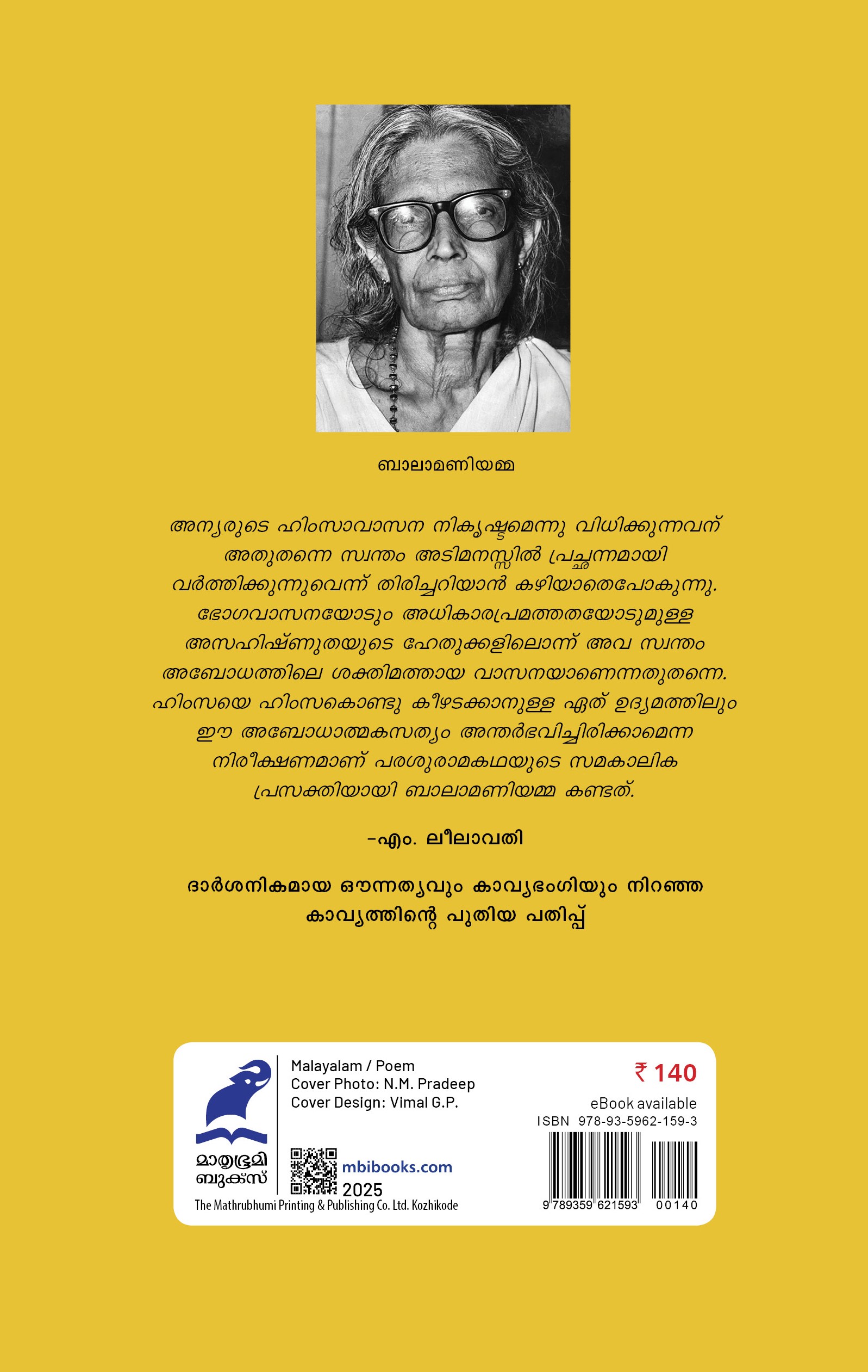 അന്യരുടെ ഹിംസാവാസന നികൃഷ്ടമെന്നു വിധിക്കുന്നവന് അതുതന്നെ സ്വന്തം അടിമനസ്സില് പ്രച്ഛന്നമായി വര്ത്തിക്കുന്നുവെന്ന് തിരിച്ചറിയാന് കഴിയാതെപോകുന്നു. ഭോഗവാസനയോടും അധികാരപ്രമത്തതയോടുമുള്ള അസഹിഷ്ണുതയുടെ ഹേതുക്കളിലൊന്ന് അവ സ്വന്തം അബോധത്തിലെ ശക്തിമത്തായ വാസനയാണെന്നതുതന്നെ. ഹിംസയെ ഹിംസകൊണ്ടു കീഴടക്കാനുള്ള ഏത് ഉദ്യമത്തിലും ഈ അബോധാത്മകസത്യം അന്തര്ഭവിച്ചിരിക്കാമെന്ന നിരീക്ഷണമാണ് പരശുരാമകഥയുടെ സമകാലിക പ്രസക്തിയായി ബാലാമണിയമ്മ കണ്ടത്.