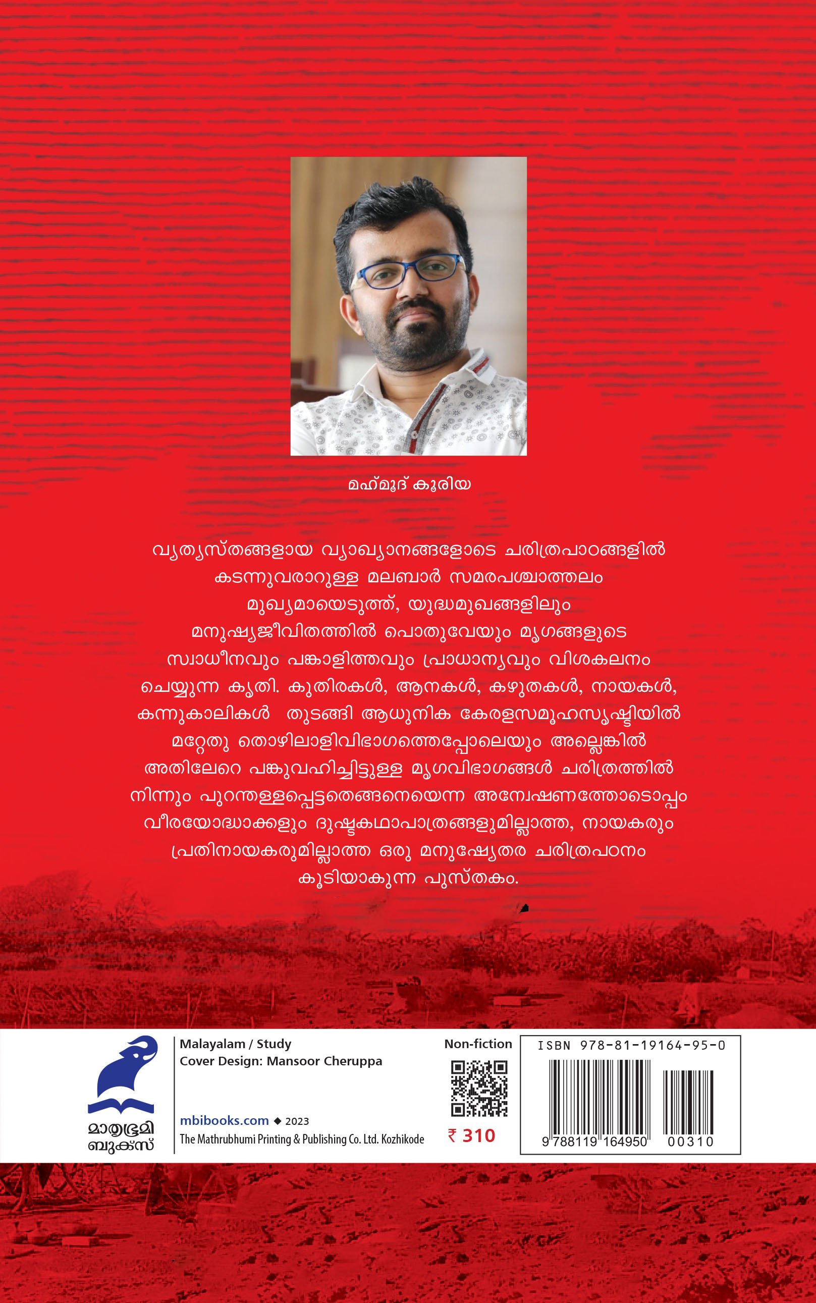 മൃഗജീവിതങ്ങളെ ചരിത്രാഖ്യാനത്തിന്റെ മുൻനിരയിലേക്ക് കൊണ്ടുവരുന്ന കൃതി. വ്യത്യസ്തങ്ങളായ വ്യാഖ്യാനങ്ങളോടെ ചരിത്രപാഠങ്ങളിൽ കടന്നുവരാറുള്ള മലബാർസമരങ്ങൾ