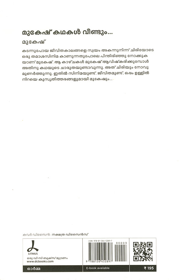 കടന്നുപോയ ജീവിതകാലങ്ങളെ സ്വയം അകന്നുനിന്ന് ചിരിയോടെ ഒരു തമാശസിനിമ കാണുന്നതുപോലെ പിന്തിരിഞ്ഞു നോക്കുകയാണ് മുകേഷ്. ആ കാഴ്ചകള്‍ മുകേഷ് ആവിഷ്‌കരിക്കുമ്പോള്‍ അതിനു കഥയുടെ ചാരുതയുണ്ടാവുന്നു. അത് ചിരിയും നോവുമുണര്‍ത്തുന്നു. ഇതില്‍ സിനിമയുണ്ട്. ജീവിതമുണ്ട്. ഒപ്പം ഉള്ളില്‍ നിറയെ കുസൃതിത്തരങ്ങളുമായി മുകേഷും…
