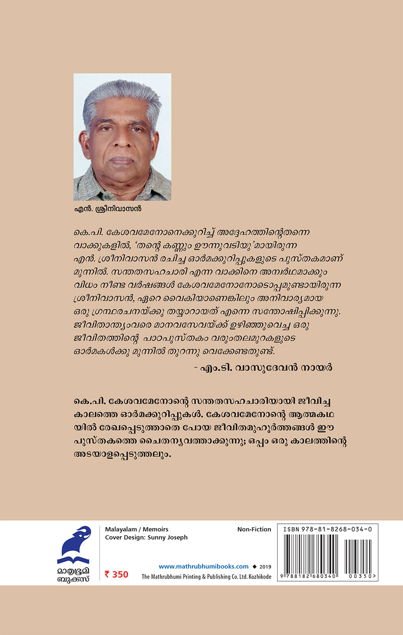 കെ.പി. കേശവമേനോനെക്കുറിച്ച് അദ്ദേഹത്തിന്റെ തന്നെ വാക്കുകളിൽ, ‘തന്റെ കണ്ണും ഊന്നുവടി’യുമായിരുന്ന എൻ. ശ്രീനിവാസൻ രചിച്ച ഓർമക്കുറിപ്പുകളുടെ പുസ്തകമാണ് മുന്നിൽ. സന്തതസഹചാരി എന്ന വാക്കിനെ അന്വർഥമാക്കും വിധം നീണ്ട വർഷങ്ങൾ കേശവമേനോനോടൊപ്പമുണ്ടായിരുന്ന ശീനിവാസൻ, ഏറെ വൈകിയാണെങ്കിലും അനിവാര്യമായി ഒരു ഗ്രന്ഥരചനയ്ക്കു തയ്യാറായത് എന്നെ സന്തോഷിപ്പിക്കുന്നു. ജീവിതാന്ത്യംവരെ മാനവസേവയ്ക്ക് ഉഴിഞ്ഞുവെച്ച ഒരു ജീവിതത്തിന്റെ പാഠപുസ്തകം വരുംതലമുറകളുടെ ഓർമകൾക്കു മുന്നിൽ തുറന്നു വെക്കേണ്ടതുണ്ട്.