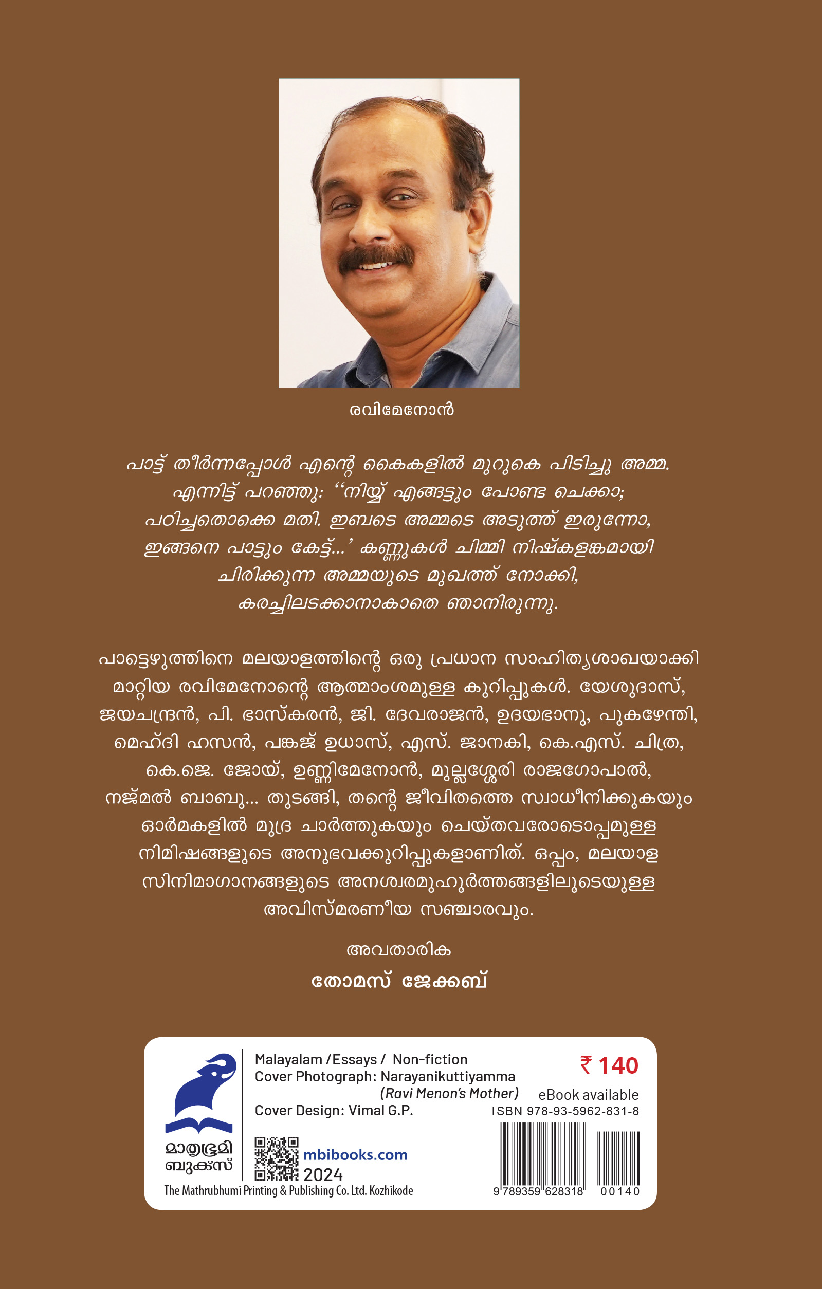പാട്ടെഴുത്തിനെ മലയാളത്തിന്റെ ഒരു പ്രധാന സാഹിത്യശാഖയാക്കി മാറ്റിയ രവിമേനോന്റെ ആത്മാംശമുള്ള കുറിപ്പുകള്‍. യേശുദാസ്, ജയചന്ദ്രന്‍, പി. ഭാസ്‌കരന്‍, ജി. ദേവരാജന്‍, ഉദയഭാനു, പുകഴേന്തി, മെഹ്ദി ഹസന്‍, പങ്കജ് ഉധാസ്, എസ്. ജാനകി, കെ.എസ്. ചിത്ര, കെ.ജെ. ജോയ്, ഉണ്ണിമേനോന്‍, മുല്ലശ്ശേരി രാജഗോപാല്‍,