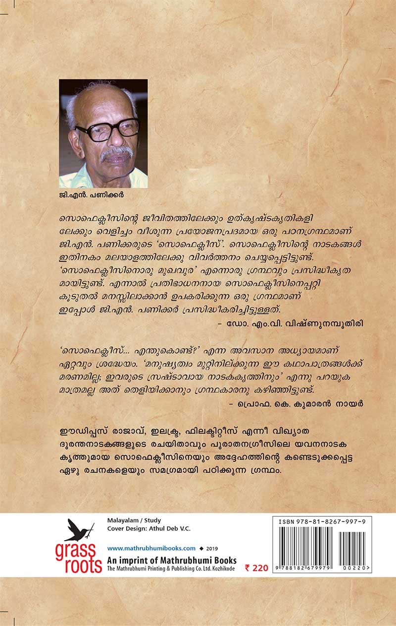 സൊഫെക്ലീസിന്റെ ജീവിതത്തിലേക്കും ഉത്കൃഷ്ടകൃതികളിലേക്കും വെളിച്ചം വീശുന്ന പ്രയോജനപ്രദമായ ഒരു പഠനഗ്രന്ഥമാണ് ജി.എൻ. പണിക്കരുടെ “സൊഫെക്ലീസ്’. സൊഫെക്ലീസിന്റെ നാടകങ്ങൾ ഇതിനകം മലയാളത്തിലേക്കു വിവർത്തനം ചെയ്യപ്പെട്ടിട്ടുണ്ട്. “സൊഫെക്ലീസിനൊരു മുഖവുര’ എന്നൊരു ഗ്രന്ഥവും പ്രസിദ്ധീകൃതമായിട്ടുണ്ട്. എന്നാൽ പ്രതിഭാധനനായ സൊഫെക്ലീസിനെപ്പറ്റി കൂടുതൽ മനസ്സിലാക്കാൻ ഉപകരിക്കുന്ന ഒരു ഗ്രന്ഥമാണ് ഇപ്പോൾ ജി.എൻ. പണിക്കർ പ്രസിദ്ധീകരിച്ചിട്ടുള്ളത്.