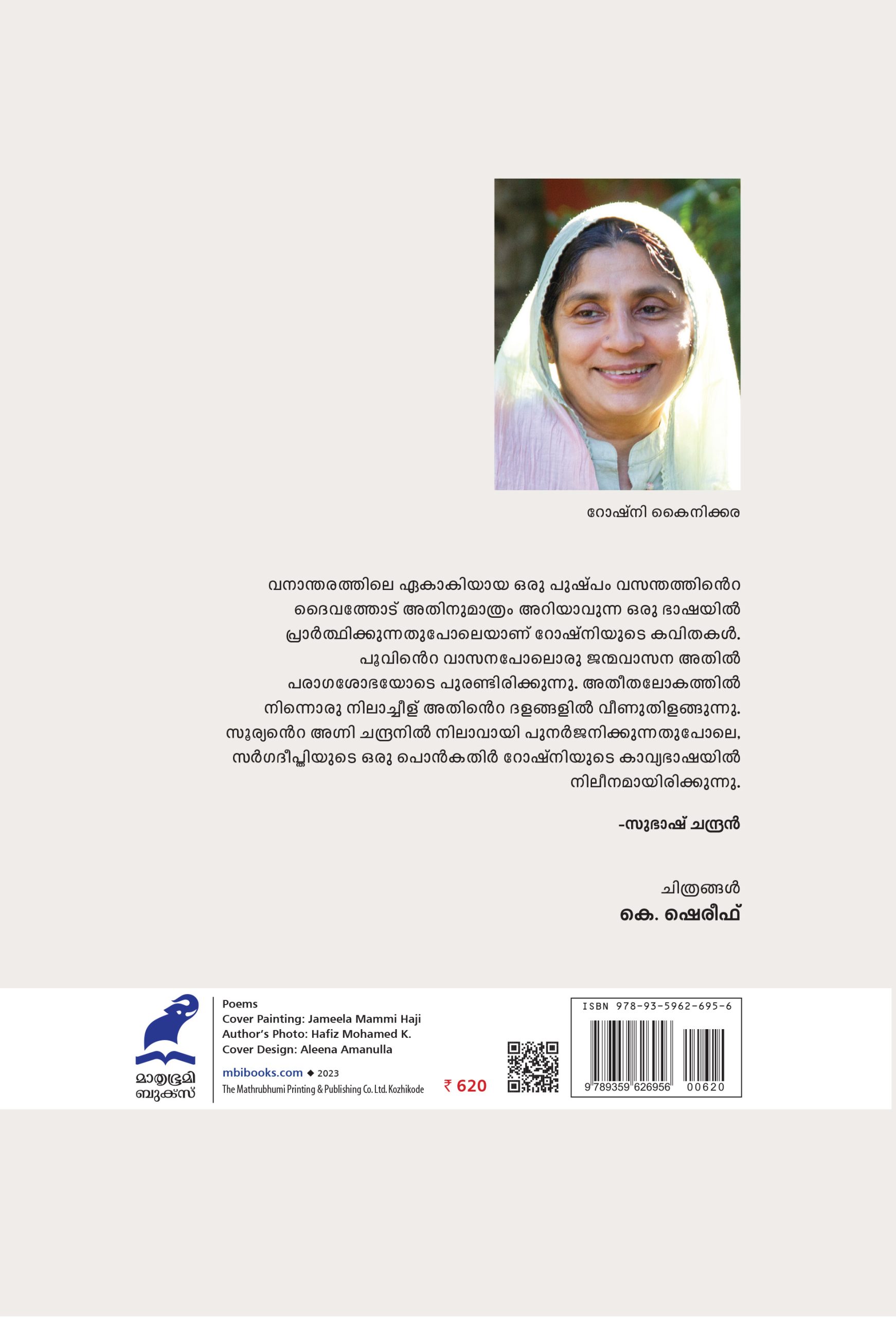 വനാന്തരത്തിലെ ഏകാകിയായ ഒരു പുഷ്പം വസന്തത്തിന്റെ ദൈവത്തോട് അതിനുമാത്രം അറിയാവുന്ന ഒരു ഭാഷയില് പ്രാര്ത്ഥിക്കുന്നതുപോലെയാണ് റോഷ്നിയുടെ കവിതകള്. പൂവിന്റെ വാസനപോലൊരു ജന്മവാസന അതില് പരാഗശോഭയോടെ പുരണ്ടിരിക്കുന്നു. അതീതലോകത്തില് നിന്നൊരു നിലാച്ചീള് അതിന്റെ ദളങ്ങളില് വീണുതിളങ്ങുന്നു. സൂര്യന്റെ അഗ്നി ചന്ദ്രനില് നിലാവായി പുനര്ജനിക്കുന്നതുപോലെ, സര്ഗദീപ്തിയുടെ ഒരു പൊന്കതിര് റോഷ്നിയുടെ കാവ്യഭാഷയില് നിലീനമായിരിക്കുന്നു.