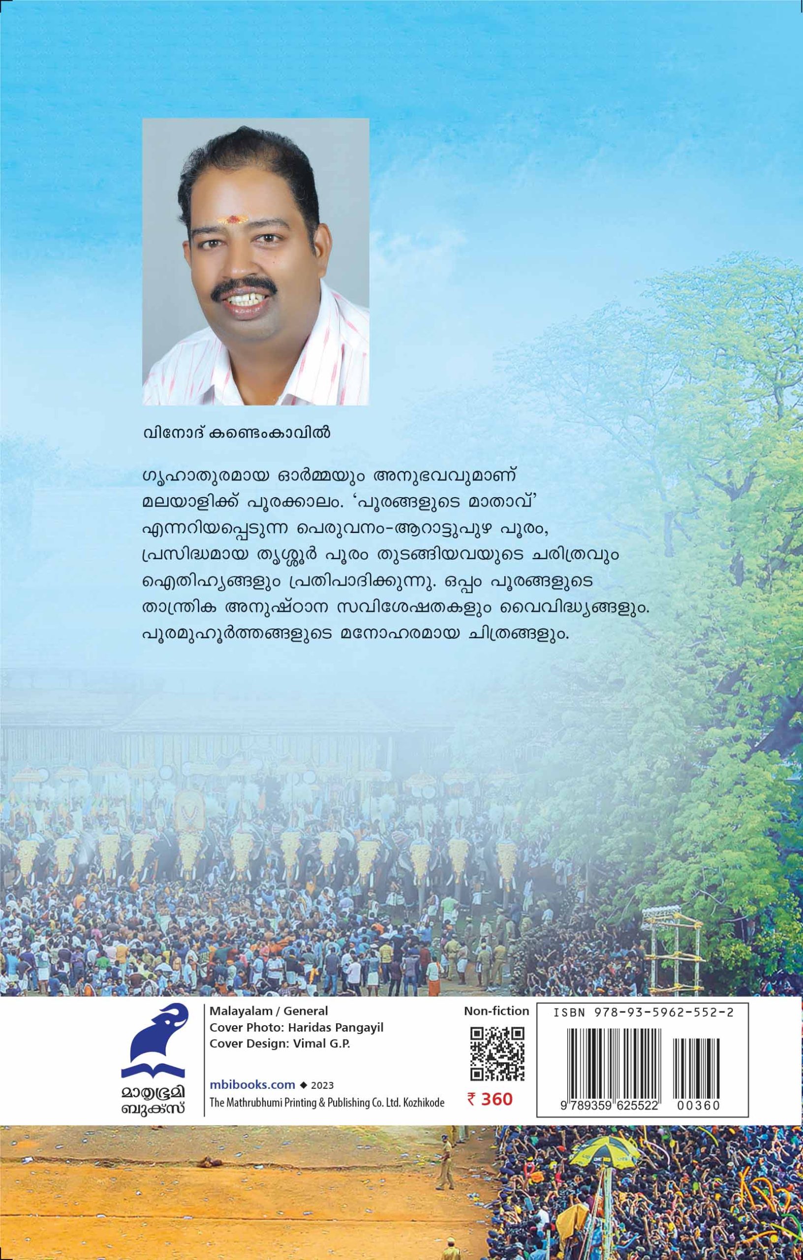 ഗൃഹാതുരമായ ഓര്മ്മയും അനുഭവവുമാണ് മലയാളിക്ക് പൂരക്കാലം. ‘പൂരങ്ങളുടെ മാതാവ്’ എന്നറിയപ്പെടുന്ന പെരുവനം-ആറാട്ടുപുഴ പൂരം, പ്രസിദ്ധമായ തൃശ്ശൂര് പൂരം തുടങ്ങിയവയുടെ ചരിത്രവും ഐതിഹ്യങ്ങളും പ്രതിപാദിക്കുന്നു. ഒപ്പം പൂരങ്ങളുടെ താന്ത്രിക അനുഷ്ഠാന സവിശേഷതകളും വൈവിദ്ധ്യങ്ങളും. പൂരമുഹൂര്ത്തങ്ങളുടെ മനോഹരമായ ചിത്രങ്ങളും.