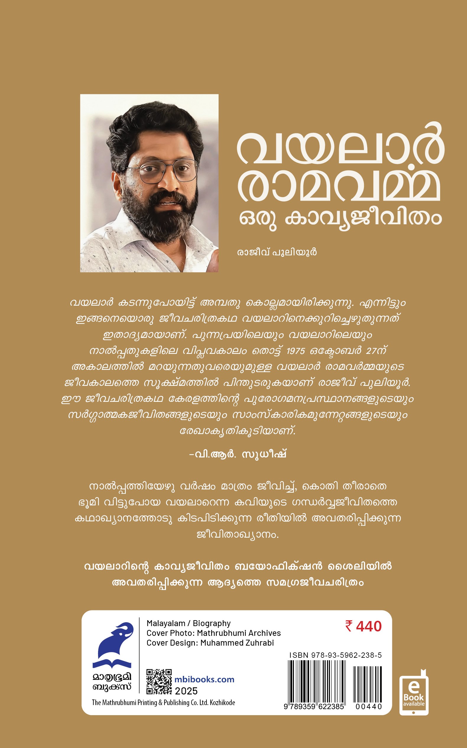 വയലാര് കടന്നുപോയിട്ട് അമ്പതു കൊല്ലമായിരിക്കുന്നു. എന്നിട്ടും ഇങ്ങനെയൊരു ജീവചരിത്രകഥ വയലാറിനെക്കുറിച്ചെഴുതുന്നത് ഇതാദ്യമായാണ്. പുന്നപ്രയിലെയും വയലാറിലെയും നാല്പ്പതുകളിലെ വിപ്ലവകാലം തൊട്ട് 1975 ഒക്ടോബര് 27ന് അകാലത്തില് മറയുന്നതുവരെയുമുള്ള വയലാര് രാമവര്മ്മയുടെ ജീവകാലത്തെ സൂക്ഷ്മത്തില് പിന്തുടരുകയാണ് രാജീവ് പുലിയൂര്. ഈ ജീവചരിത്രകഥ കേരളത്തിന്റെ പുരോഗമനപ്രസ്ഥാനങ്ങളുടെയും സര്ഗ്ഗാത്മകജീവിതങ്ങളുടെയും സാംസ്കാരികമുന്നേറ്റങ്ങളുടെയും രേഖാകൃതികൂടിയാണ്.